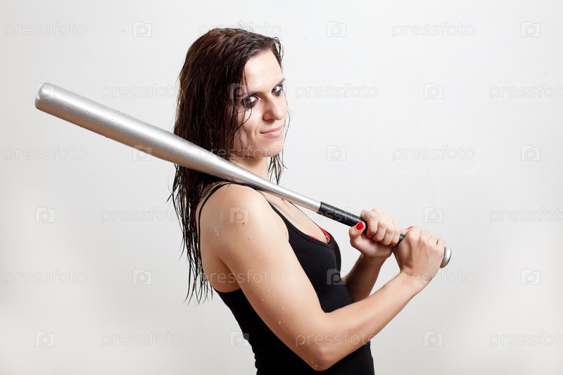 Мокрая женщина с бейсбольной битой