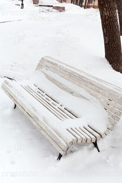 Белый снег на деревянной скамье