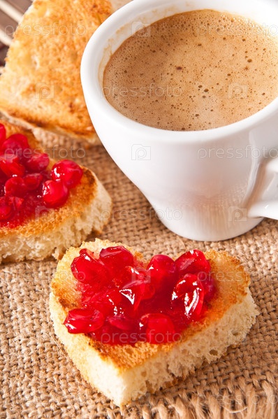 Тосты с джемом в форме сердец и чашка кофе