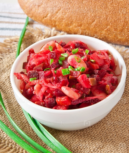 Салат из свеклы, моркови, огурцов, фасоли и лука, известный как винегрет