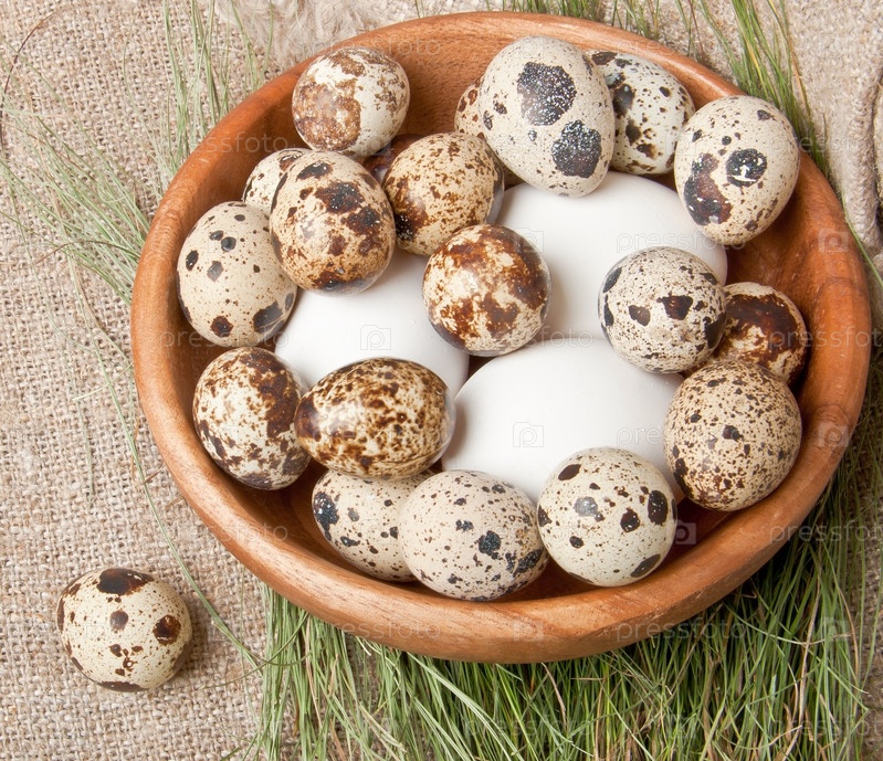Куриные и перепелиные яйца в деревянной чашке