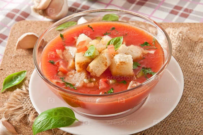 Холодный гаспачо с чесночными гренками в стеклянной миске