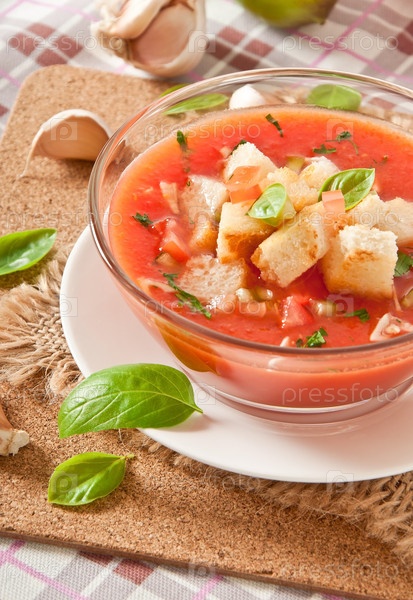 Холодный гаспачо с чесночными гренками в стеклянной миске