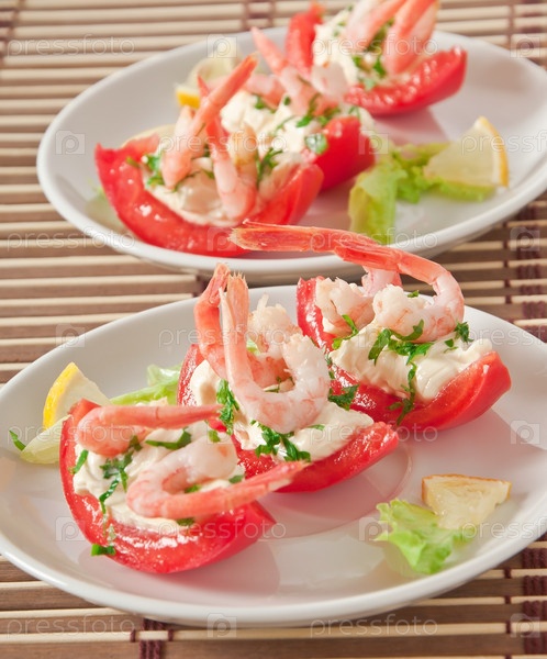 Половинки томатов заполнены коктейлем из креветок