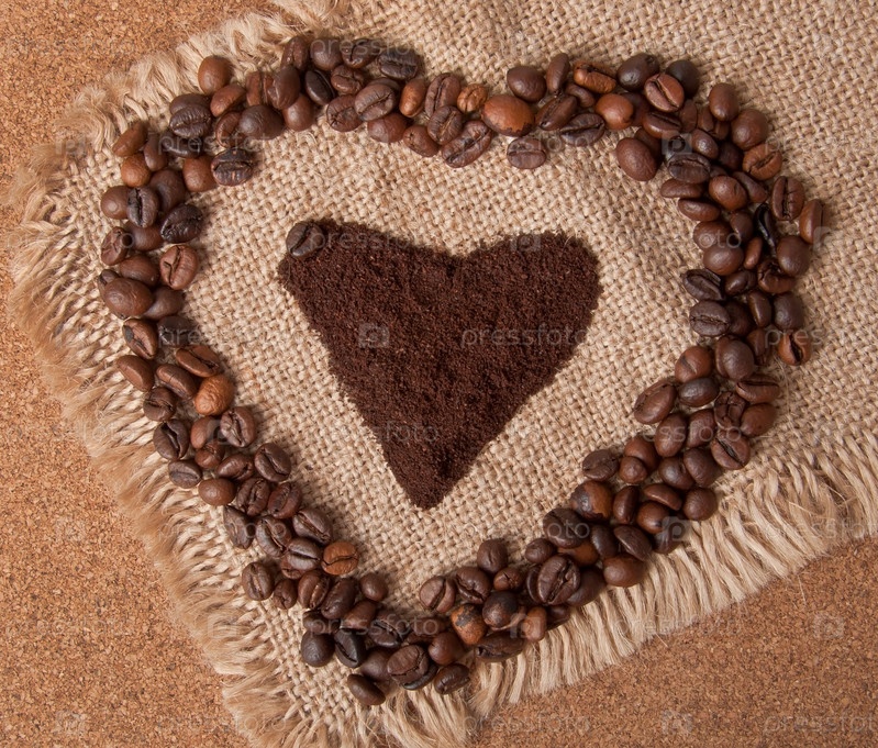 Сердце из молотого кофе и кофейных зерен на фоне мешковины