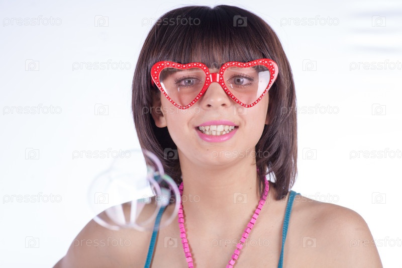 Улыбающаяся красивая девушка в очках на белом фоне
