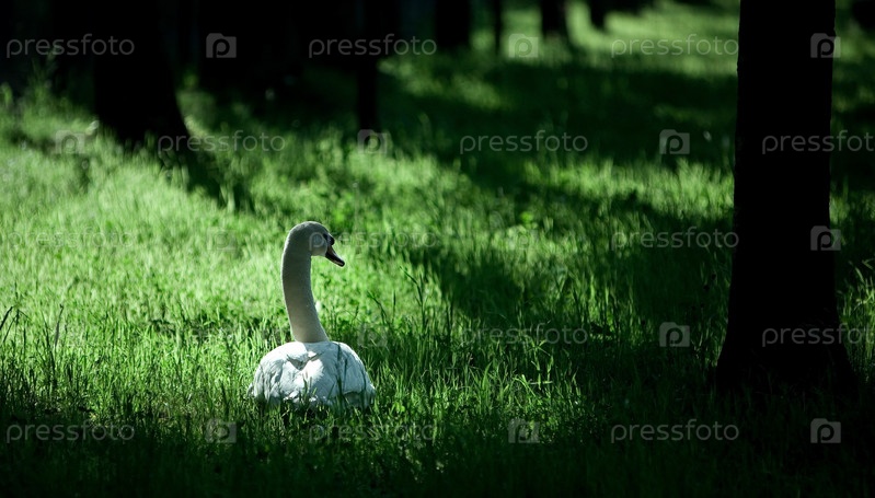 Белый лебедь на траве в лесу