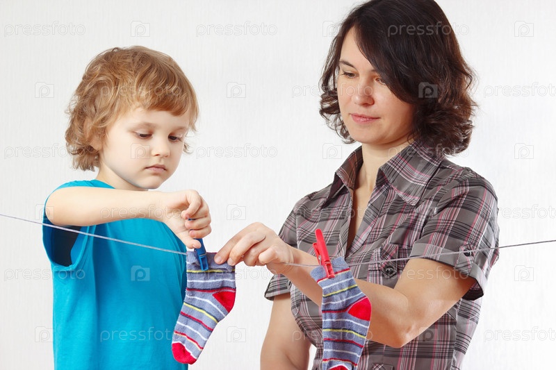 Маленький мальчик помогает маме повесить свои носки на веревку