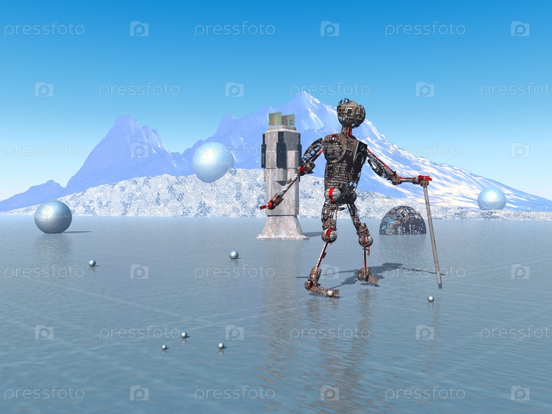 Фантастический пейзаж со сферами, горой и роботом