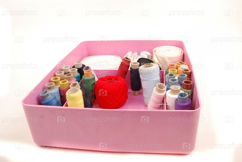 Маленькие катушки с нитками в коробке на белом фоне
