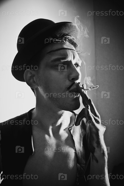 Ретро-портрет красивого молодого человека в шляпе с сигаретой