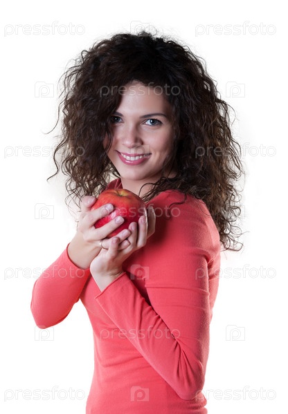 Молодая женщина с яблоком на белом фоне