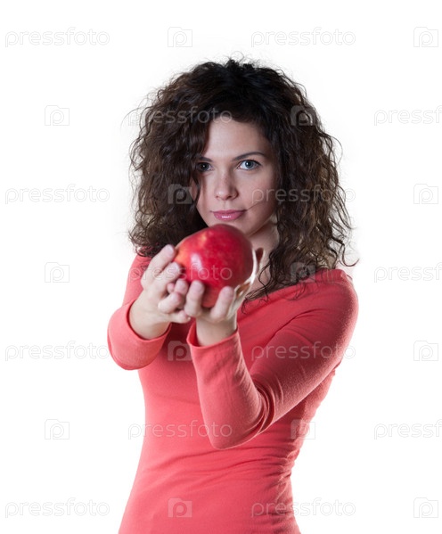 Молодая женщина с яблоком на белом фоне