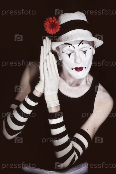 Спящий мим в белой шляпе с красным цветком на черном фоне
