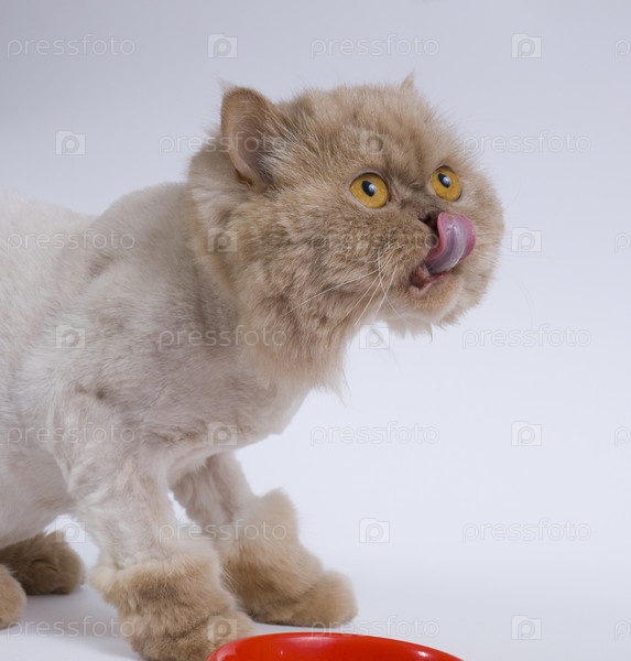 Персидский кот облизывается у чашки с едой