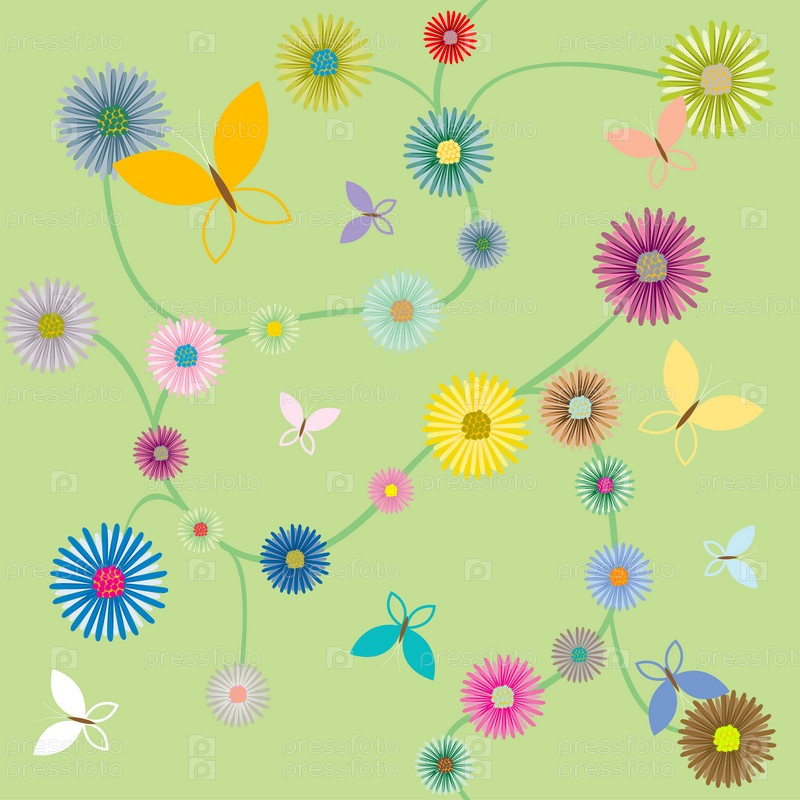 Бабочки и цветы на зеленом фоне