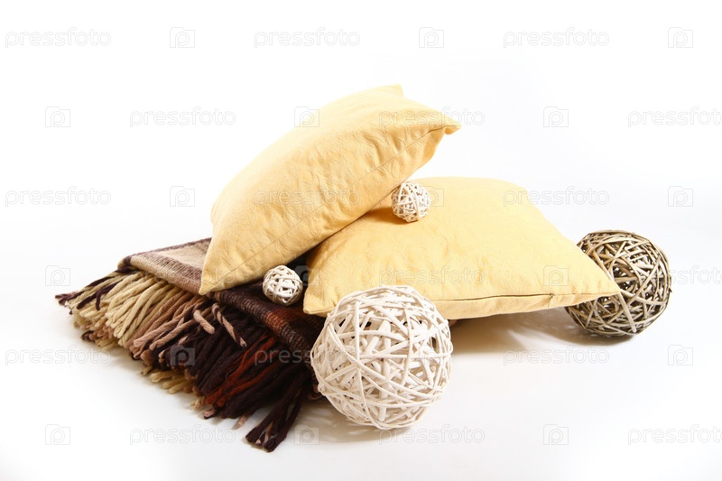 Подушка, плед и плетеные шары на белом фоне