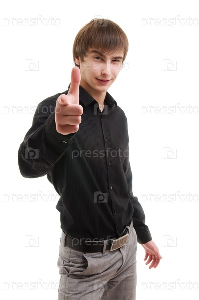 Молодой парень указывает пальцем на белом фоне