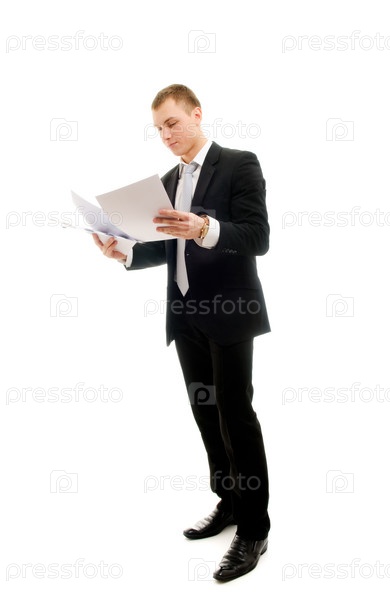 Бизнесмен с документами на белом фоне
