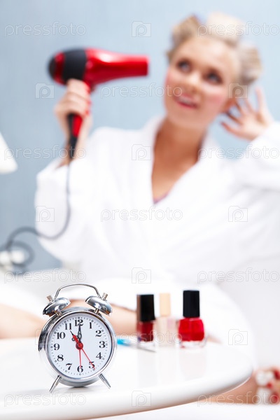 Изображение будильника на фоне женщины, высушивающей волосы