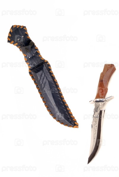 Охотничий нож для резки мяса и чехол на белом фоне
