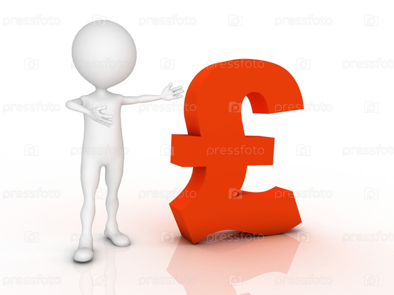 3D-человек опирается на знак фунта, изолированный на белом фоне