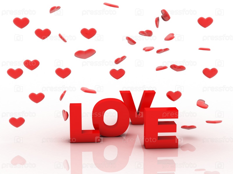 Слово ЛЮБОВЬ из трехмерных букв и красные сердца, летающие в воздухе, на белом фоне