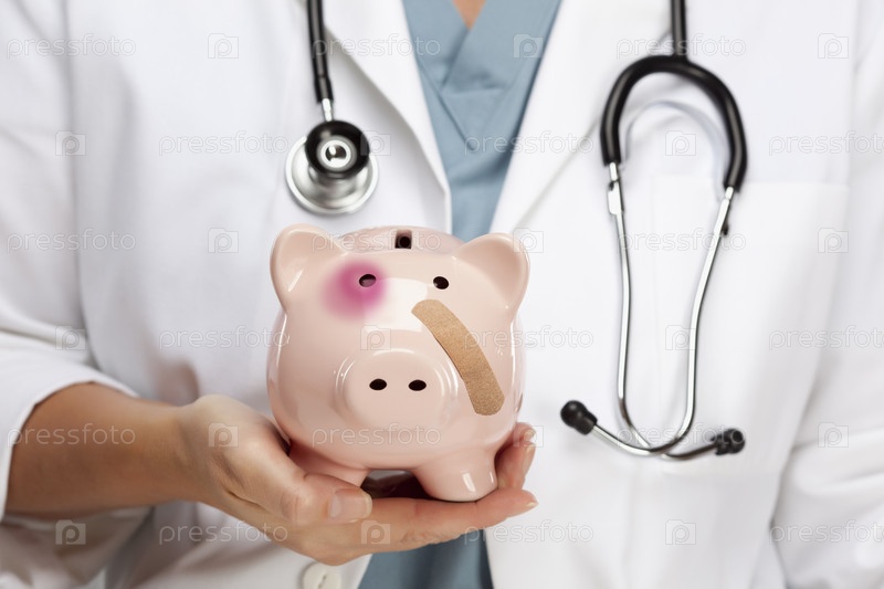 Доктор держит копилку с синяком под глазом и пластырем