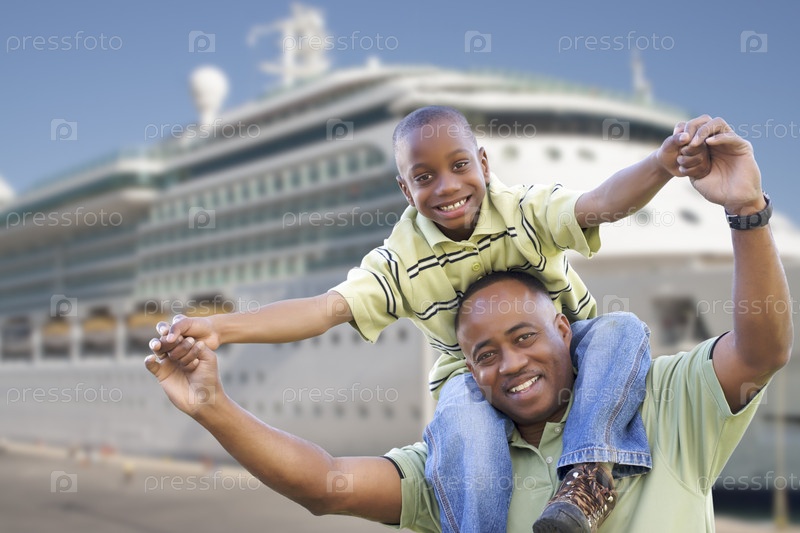 Счастливый отец и сын на фоне круизного судна