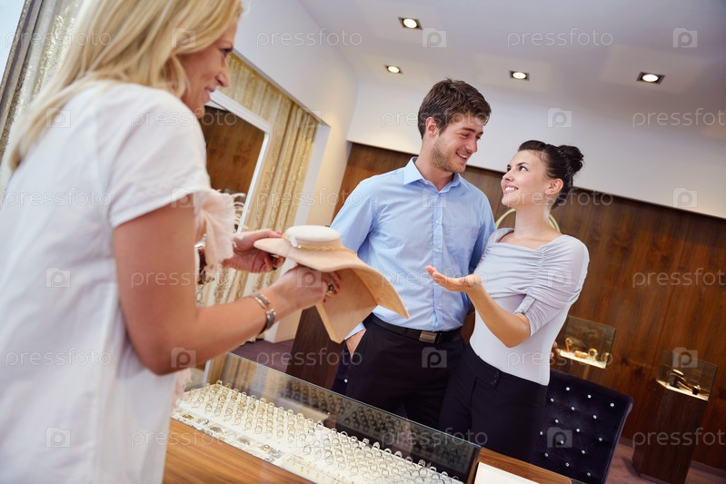 Счастливая молодая пара в магазине ювелирных изделий