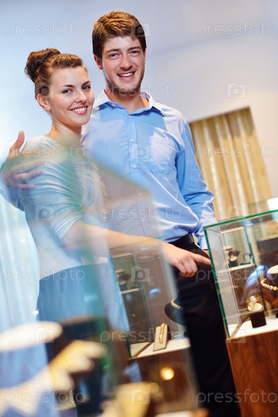 Счастливая молодая пара в магазине ювелирных изделий