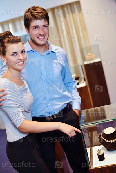 Счастливая молодая пара в магазине ювелирных изделий