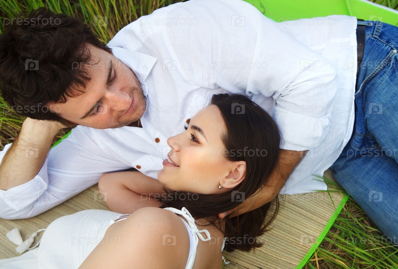 Счастливая молодая пара на летнем лугу