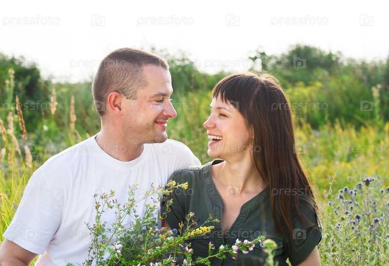 Счастливая молодая пара на летнем лугу