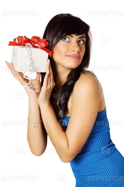 Девушка слушает подарочную коробку