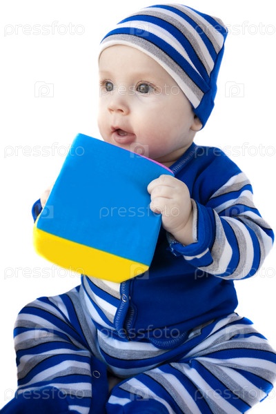 Ребенок в 6-7 месяцев в полосатом костюме играет с кубиком
