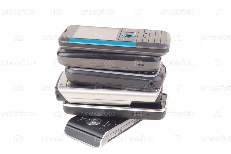 Куча мобильных телефонов на белом фоне