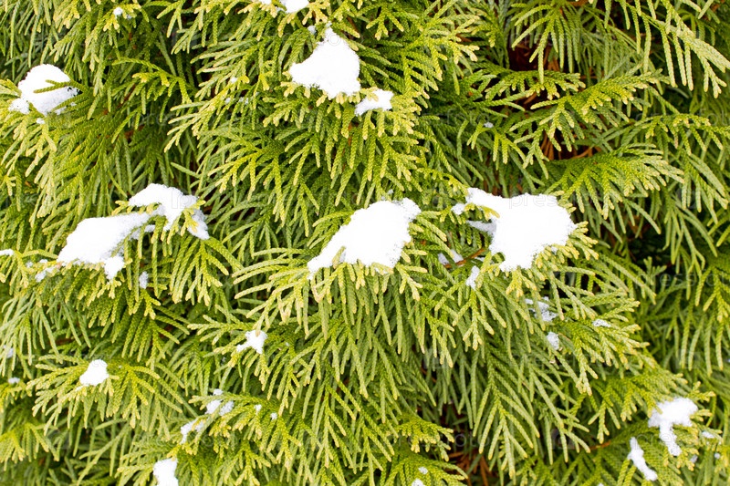 Снег на ветках туи
