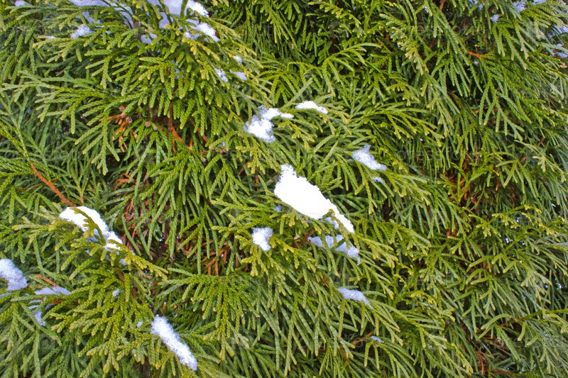 Снег на ветках туи