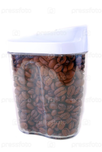 Жареные кофейные зерна в контейнере на белом фоне