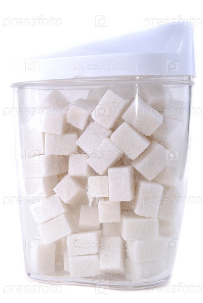 Сахар рафинад в прозрачном контейнере на белом фоне