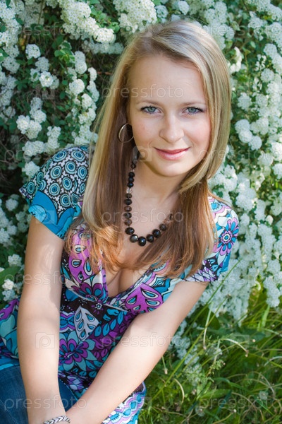 Светловолосая девушка сидит в саду рядом с цветущим кустом