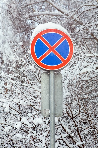 Дорожный знак покрыт слоем снега