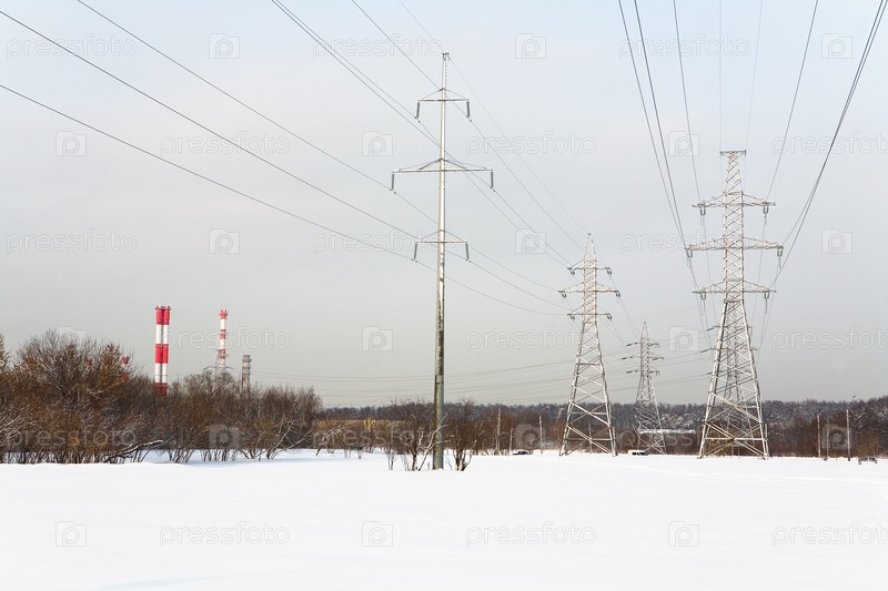 Высокие линии электропередач напряжения в зимний период