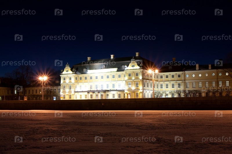 Меншиковский дворец на набережной ночью реки Невы, Санкт-Петербург, Россия