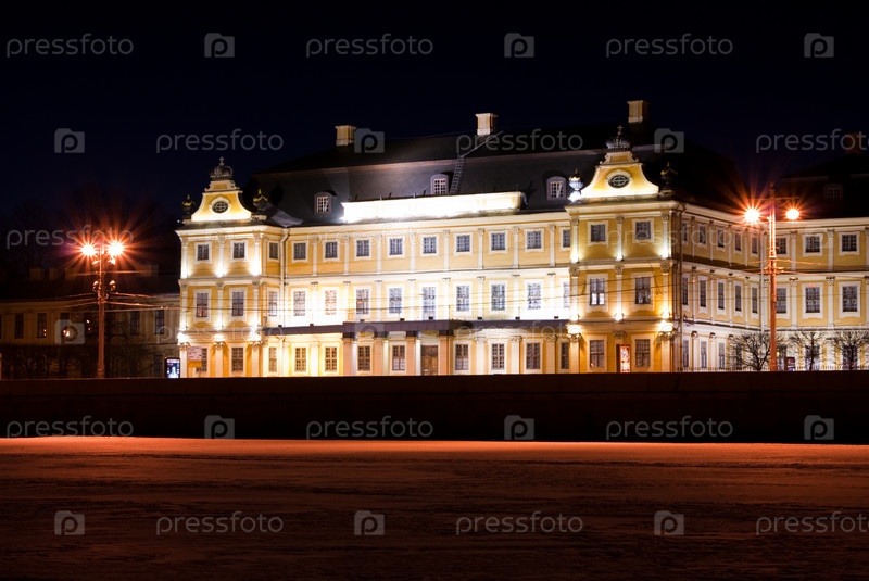 Меншиковский дворец на набережной ночью реки Невы, Санкт-Петербург, Россия