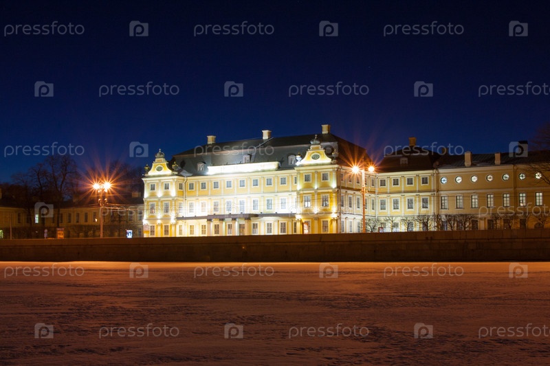 Меншиковский дворец ночью на набережной реки Невы, Санкт-Петербург, Россия