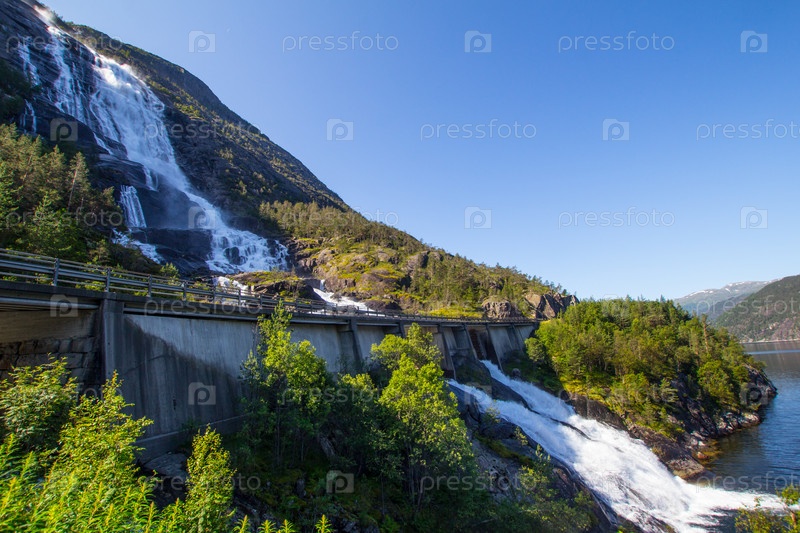 Летний горный водопад Лангфоссен на склоне Этне, Норвегия