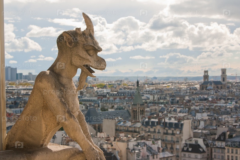 Горгулья на Нотр-Даме и город Париж, Франция