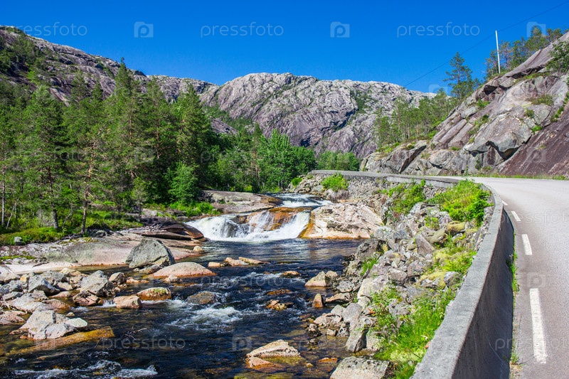 Поток горной реке из тающего ледника. Начало водопада Лангфоссен, Норвегия